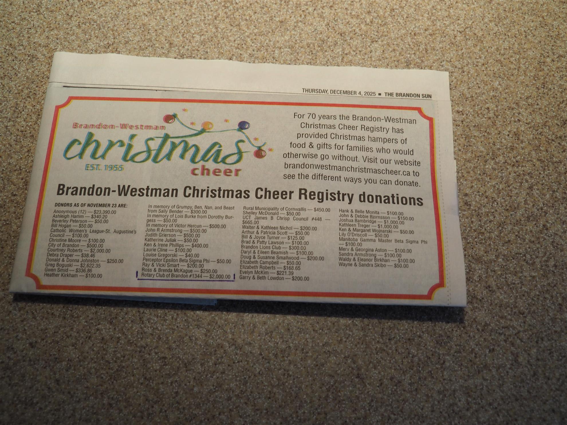 The Rotary Club of Brandon’s holiday spirit was on full display in the December 4, 2025, edition of the Brandon Sun, which featured the club’s generous contribution to the Brandon Christmas Cheer Fund.